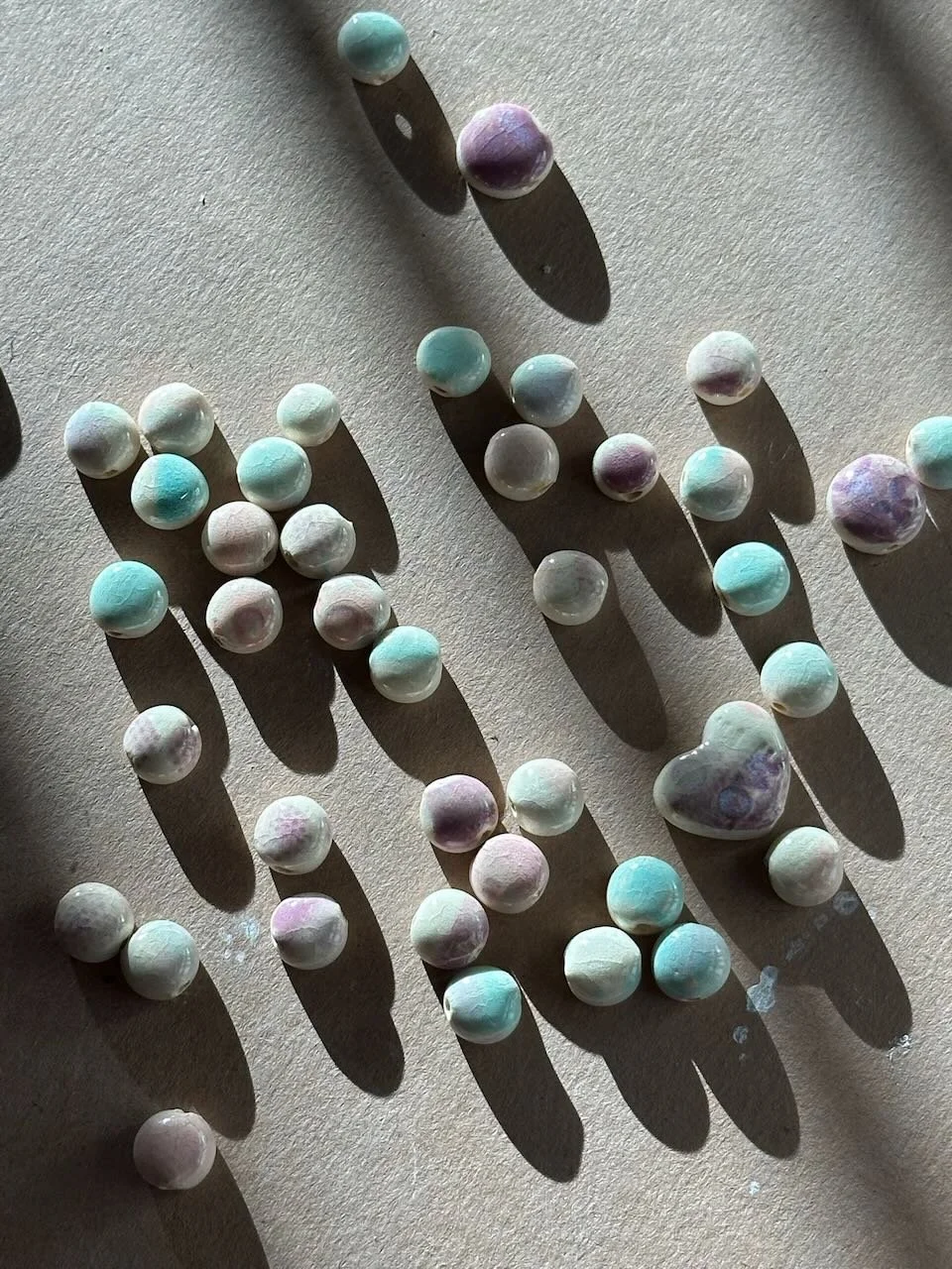 I was thinking of the Bacharach/David song when I divided a small slab of clay into two for yet, another set of trial slabs. I repeatedly stamped “LOVE” on both slabs. On this slab, I painted bright pastels; think happy cotton candy or magical unicorn birthday party. The two mini-slabs resulted in my first set of dots that actually worked in the way I wanted them to. Hooray! I figured out the depth of clay and how much pressure I could use with impressions; (press too hard and it’s too thin to drill holes for the dot.) I love the way the aqua, light purple and bits of pink work with each other, sometimes overlapping to create a different color, and many times showing up as a single happy color on a dot. So the original series was created in two little slabs, and it’s about love; seems like a fitting story to launch Connected Dots Project.